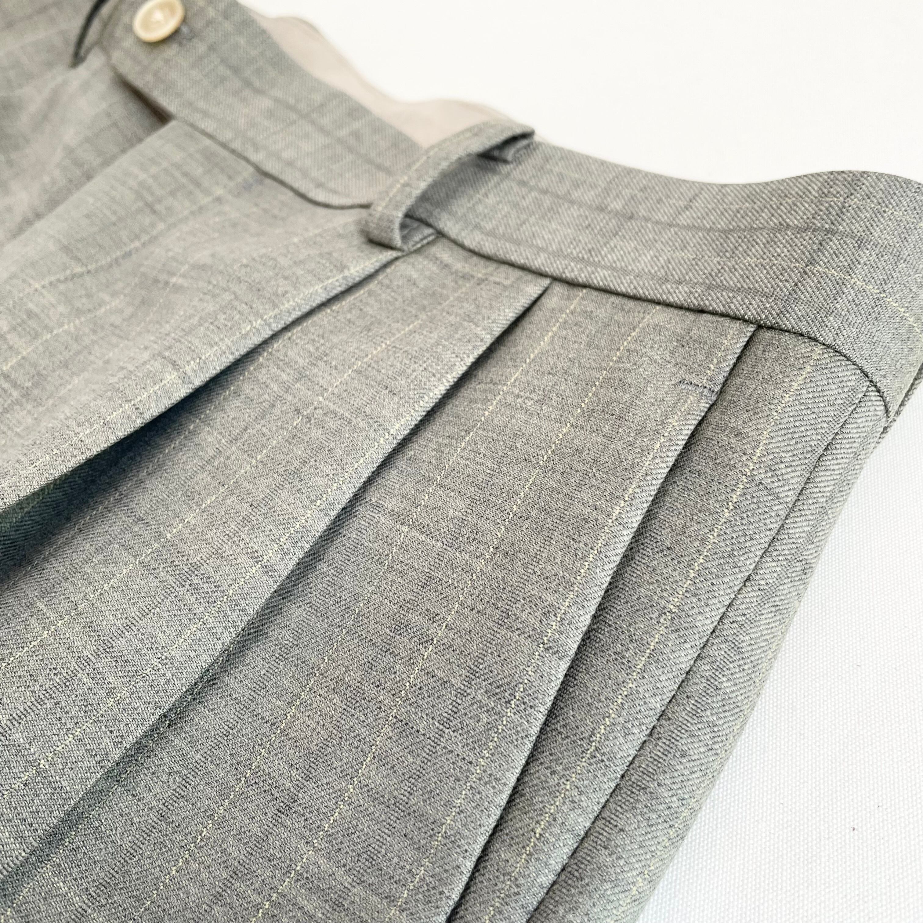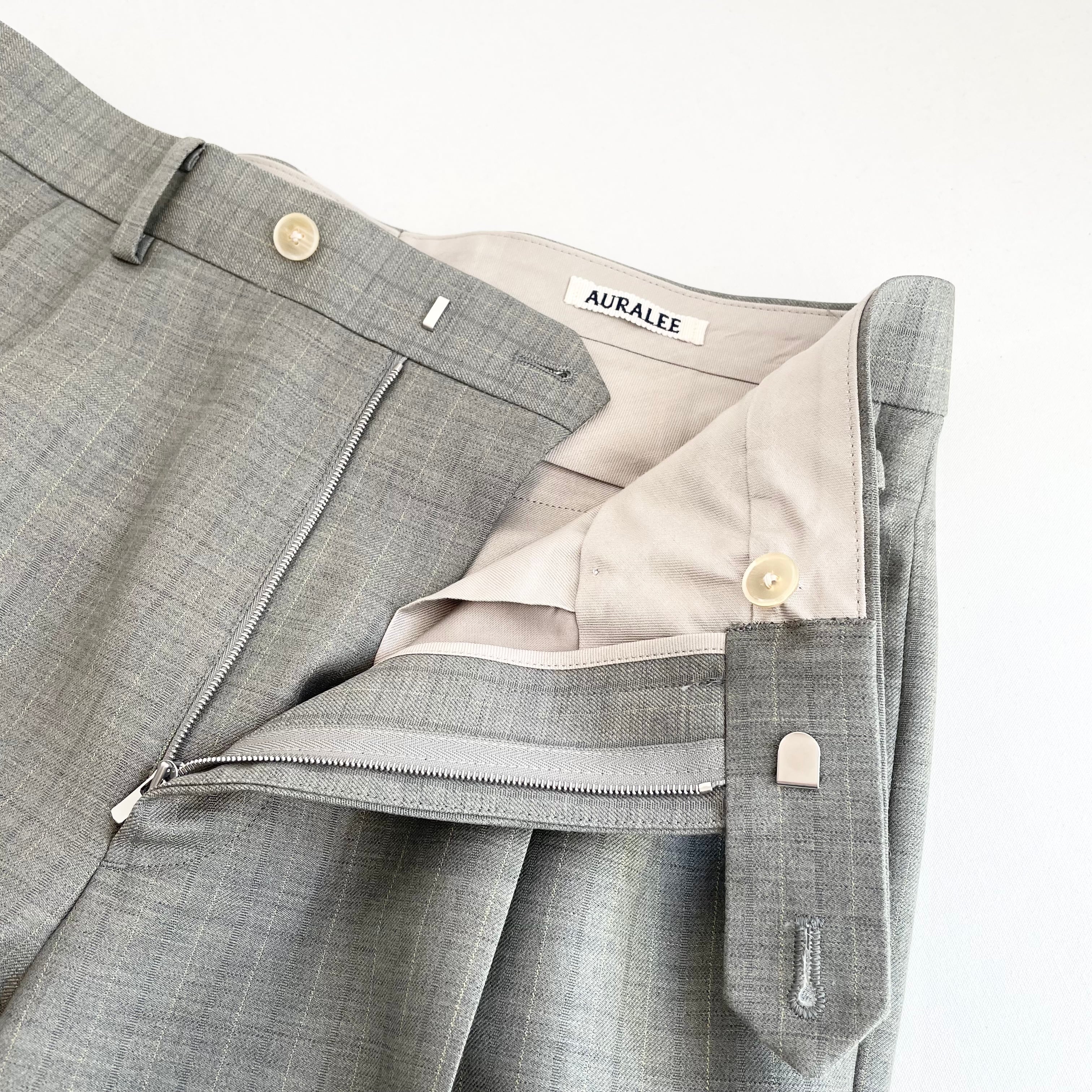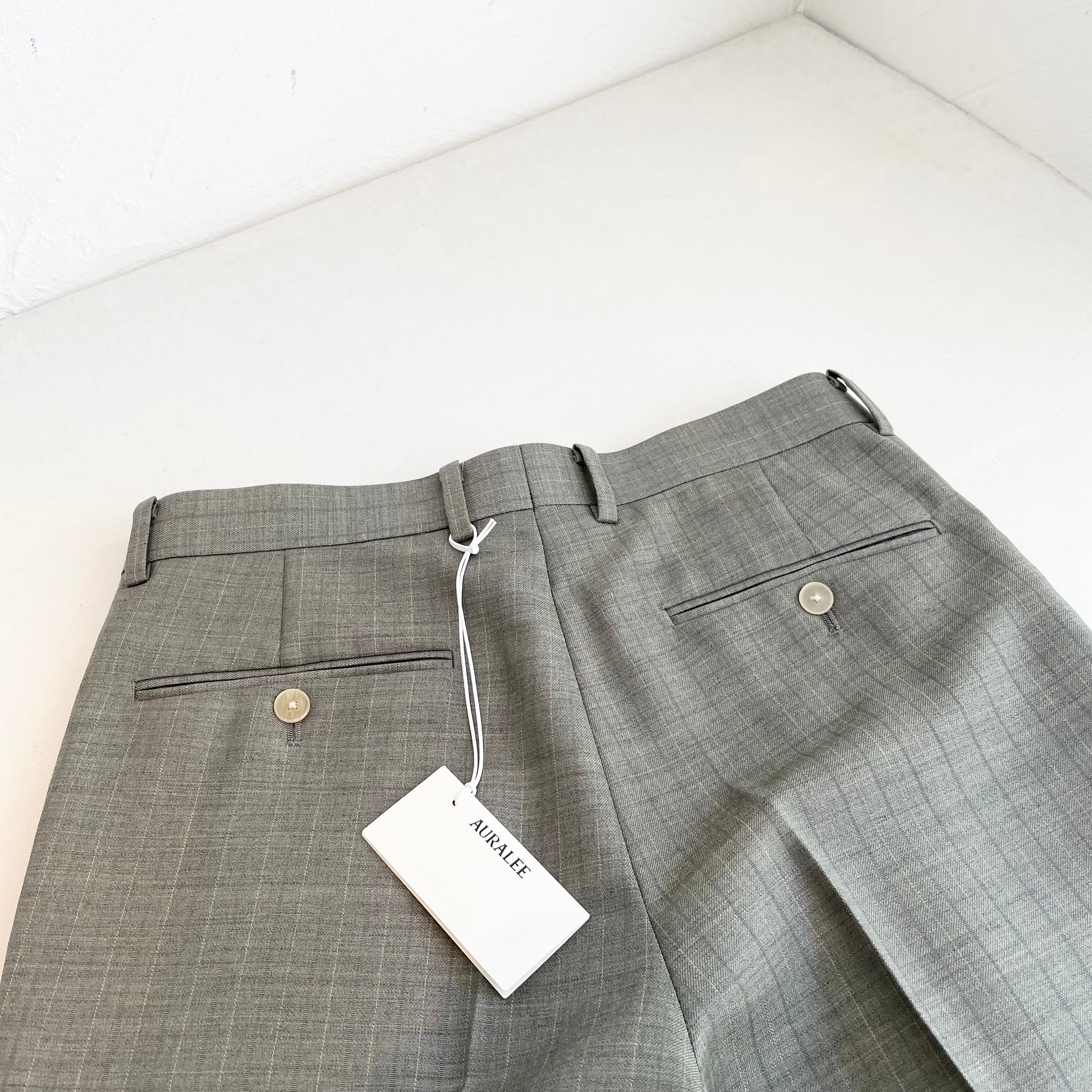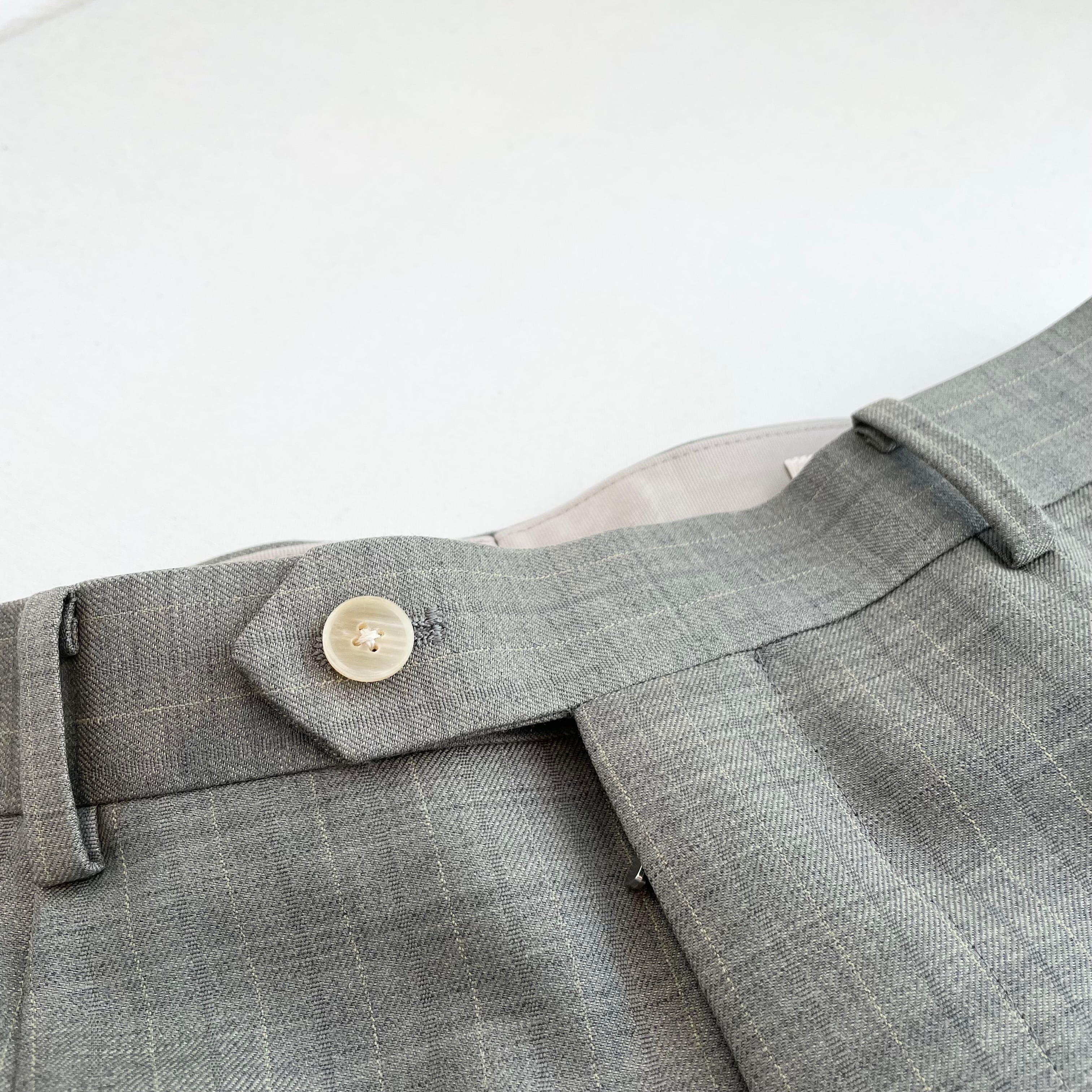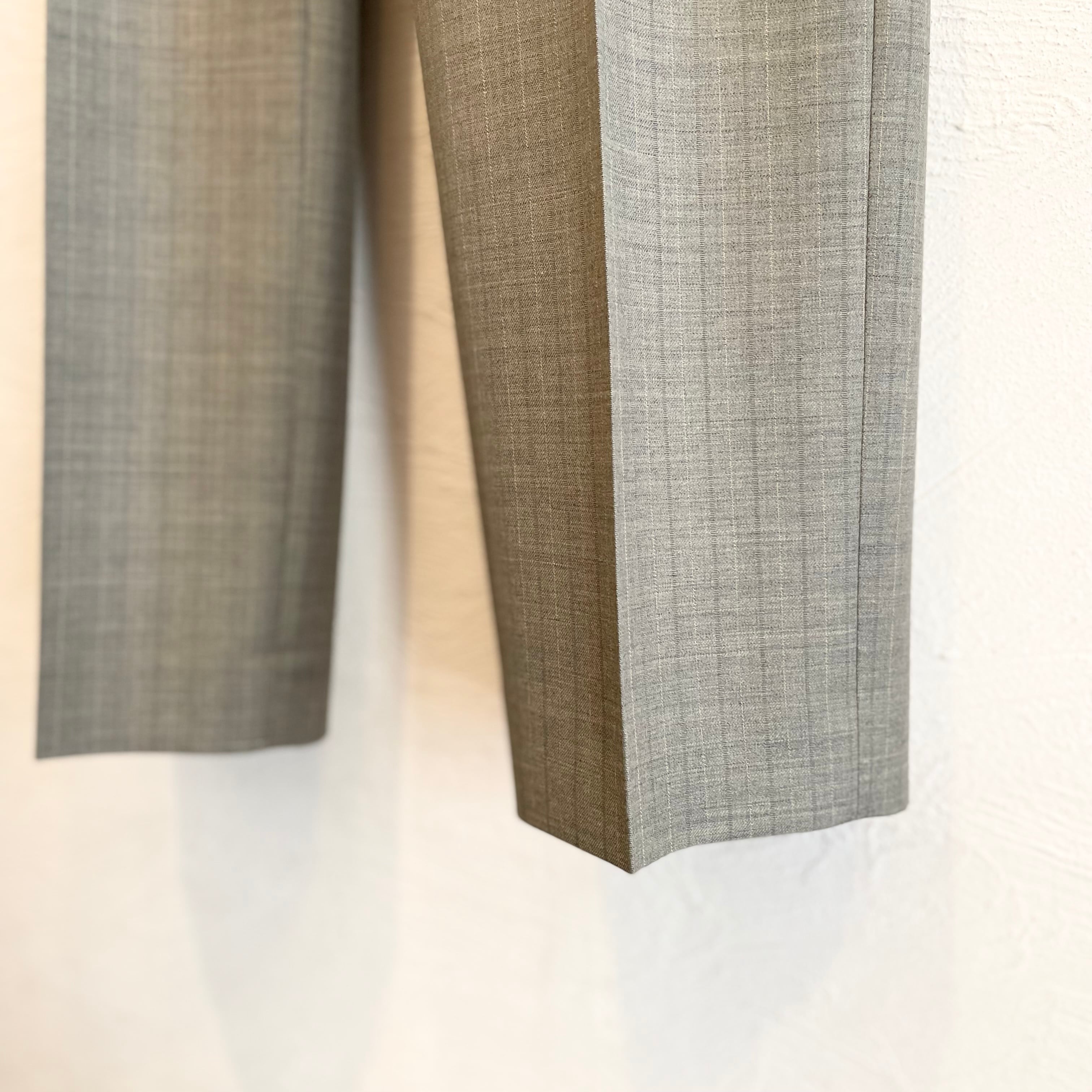 経糸にはスーパー130’sのスーパーエキストラファインメリノを、緯糸には英国羊毛ブルーフェイスラスター種の梳毛糸を使用した贅沢な素材です。
