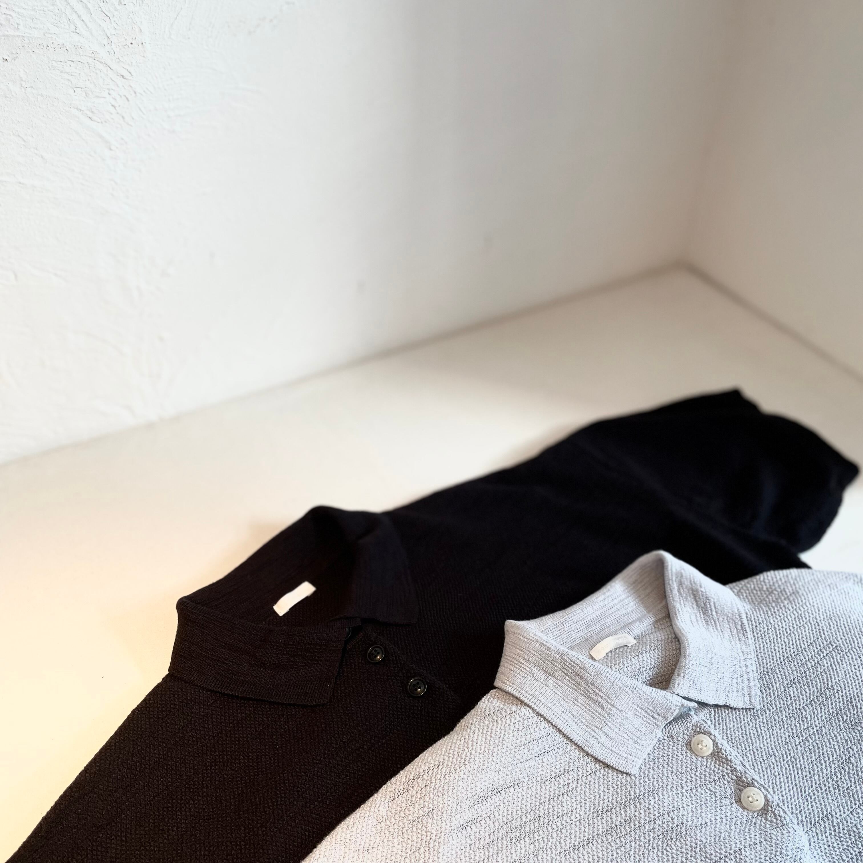 そのため表面の所々に小さく透ける部分が生まれ、さらに全面にシングル鹿の子を編むことで、縦横に特徴的な凹凸ができ、夏らしい肌離れのよい編地になっております。