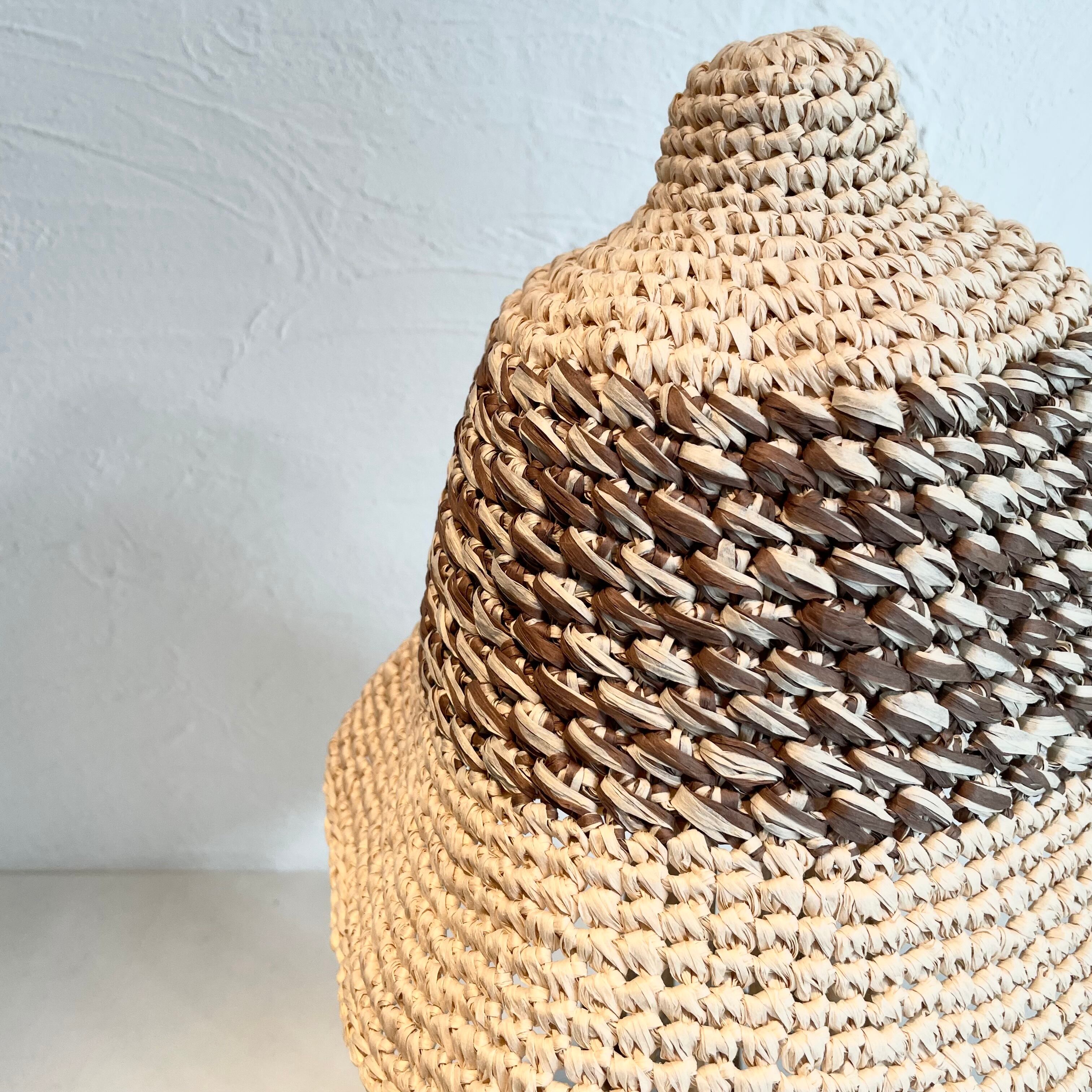 編み地の切り替えによる立体感と、手編みならではの素朴な表情が相まって、存在感のあるフォルムにやわらかな印象を添えています。